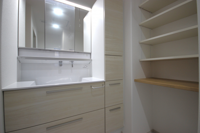 お掃除ラクラク、鏡の後ろにもたっぷり収納できるシャンプードレッサー。