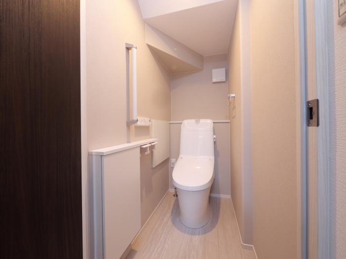 ペーパーホルダー脇の収納キャビネットに加え、備え付け収納を設置。トイレットペーパー(12個入)を袋ごと収納できる奥行を確保しています。