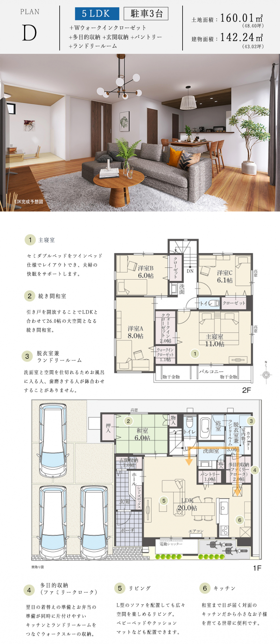 - 間取り:5LDK+ 多目的収納+ Wウォークインクローゼット+ 玄関収納+ パントリー+ ランドリールーム