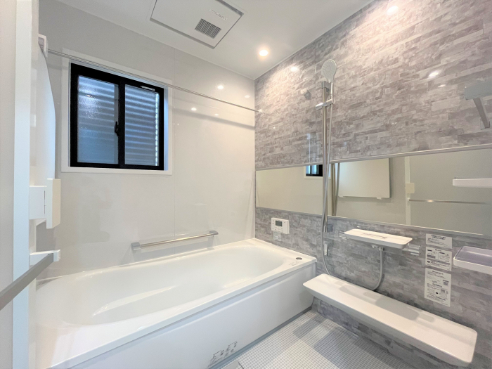 少し大きめ1717(1坪)サイズ。バリアフリー仕様のシステムバス。保温材付きの魔法びん浴槽。お掃除ラクラクほっカラリ床。