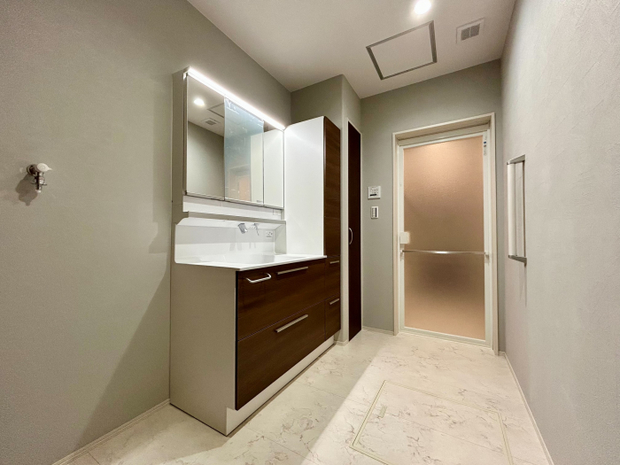 お掃除ラクラク、鏡の後ろにもたっぷり収納できるシャンプードレッサー。