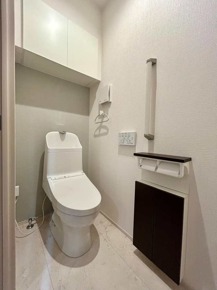 ペーパーホルダー脇の収納キャビネットに加え、備え付け収納を設置。トイレットペーパー(12個入)を袋ごと収納できる奥行を確保しています。