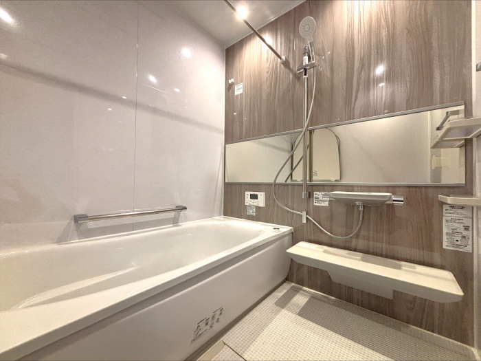 少し大きめ1717(1坪)サイズ。バリアフリー仕様のシステムバス。保温材付きの魔法びん浴槽。お掃除ラクラクほっカラリ床。
