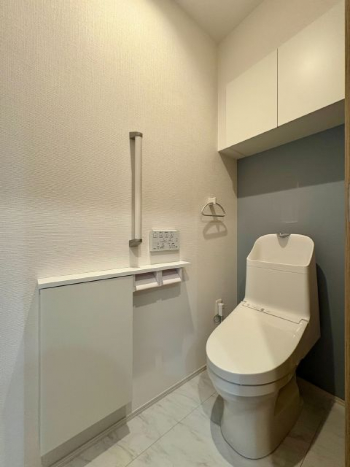 ペーパーホルダー脇の収納キャビネットに加え、備え付け収納を設置。トイレットペーパー(12個入)を袋ごと収納できる奥行を確保しています。