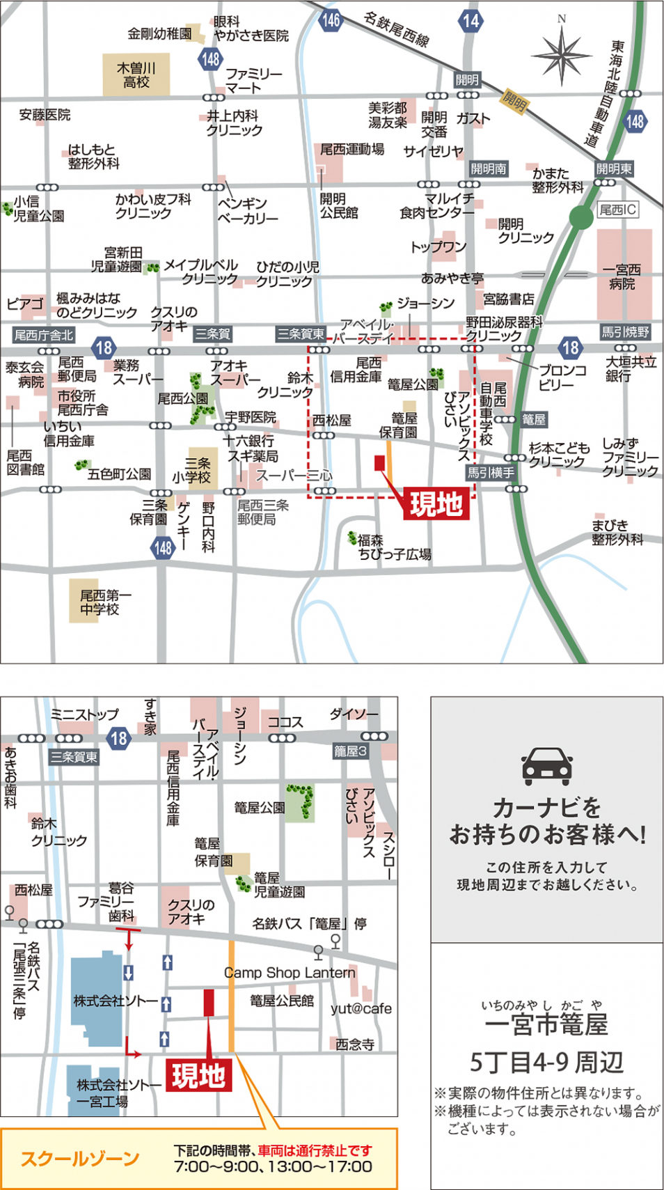 ・所要時間は地図上の概測距離を80m=徒歩1分、250m=自転車1分、車は時速40㎞で計算したものです。