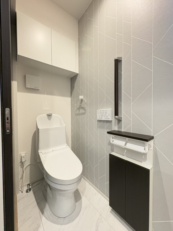 ペーパーホルダー脇の収納キャビネットに加え、備え付け収納を設置。トイレットペーパー(12個入)を袋ごと収納できる奥行を確保しています。