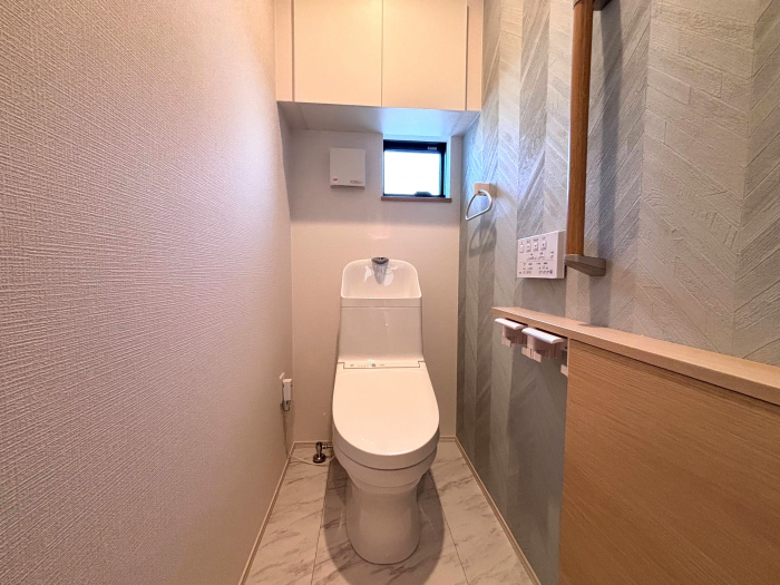 ペーパーホルダー脇の収納キャビネットに加え、備え付け収納を設置。トイレットペーパー(12個入)を袋ごと収納できる奥行を確保しています。