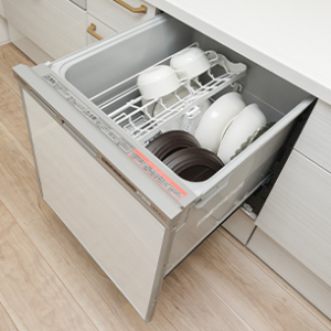 ソフトクロージング機能、ロック機能付き包丁差し、上置きトレーなど、たっぷり入って出し入れスマート。