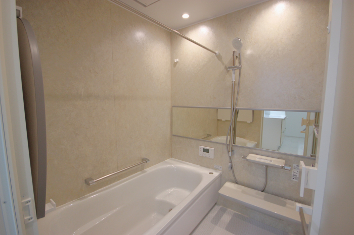 少し大きめ1717(1坪)サイズ。バリアフリー仕様のシステムバス。保温材付きの魔法びん浴槽。お掃除ラクラクほっカラリ床。
