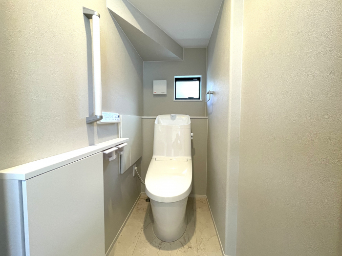 ペーパーホルダー脇の収納キャビネットに加え、備え付け収納を設置。トイレットペーパー(12個入)を袋ごと収納できる奥行を確保しています。