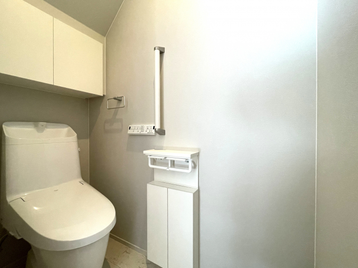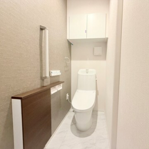 ペーパーホルダー脇の収納キャビネットに加え、備え付け収納を設置。トイレットペーパー(12個入)を袋ごと収納できる奥行を確保しています。