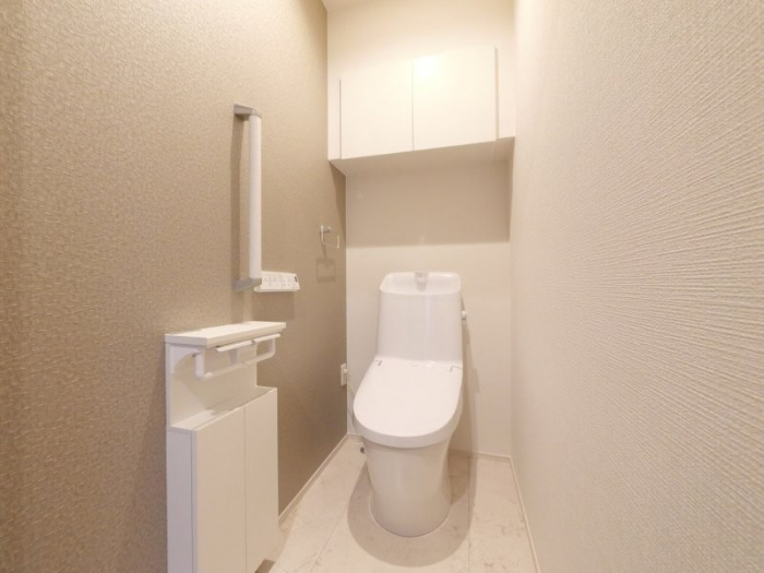 ペーパーホルダー脇の収納キャビネットに加え、備え付け収納を設置。トイレットペーパー(12個入)を袋ごと収納できる奥行を確保しています。