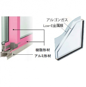 アルミと樹脂のハイブリット構造で高断熱と結露軽減を実現。ガラス面は高遮熱仕様のアルゴンガス入りLow-E複層ガラスを採用。
