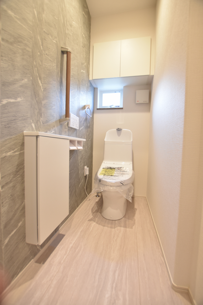 ペーパーホルダー脇の収納キャビネットに加え、備え付け収納を設置。トイレットペーパー(12個入)を袋ごと収納できる奥行を確保しています。