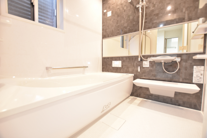 少し大きめ1717(1坪)サイズ。バリアフリー仕様のシステムバス。保温材付きの魔法びん浴槽。お掃除ラクラクほっカラリ床。
