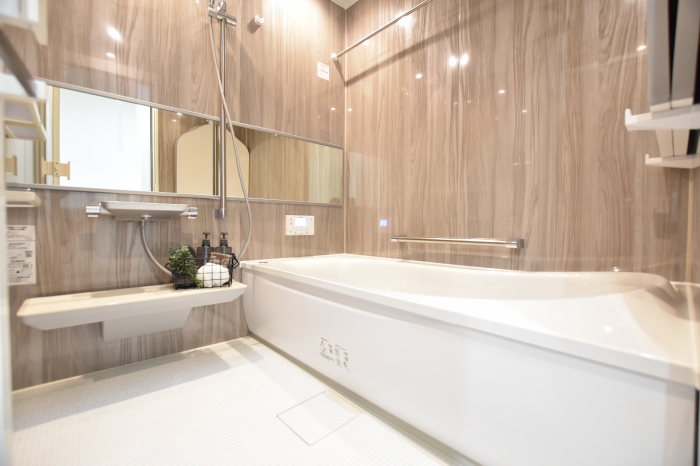 少し大きめ1717(1坪)サイズ。バリアフリー仕様のシステムバス。保温材付きの魔法びん浴槽。お掃除ラクラクほっカラリ床。