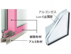 アルミと樹脂のハイブリット構造で高断熱と結露軽減を実現。ガラス面は高遮熱仕様のアルゴンガス入りLow-E複層ガラスを採用。