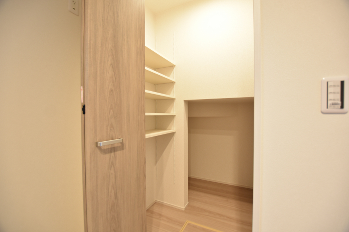 タオルや着替え、洗剤のストック品など何でも収納できる大きな物入。