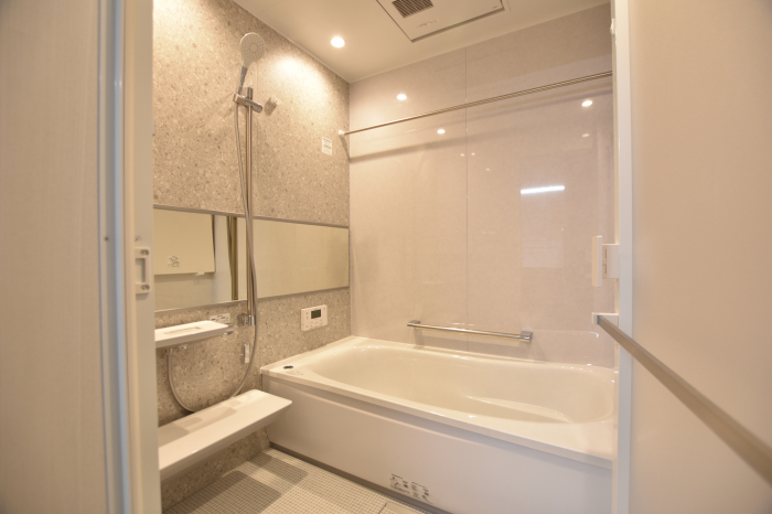 バリアフリー仕様のシステムバス。保温材付きの魔法びん浴槽。お掃除ラクラクほっカラリ床。