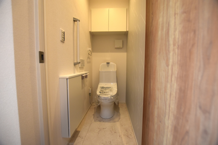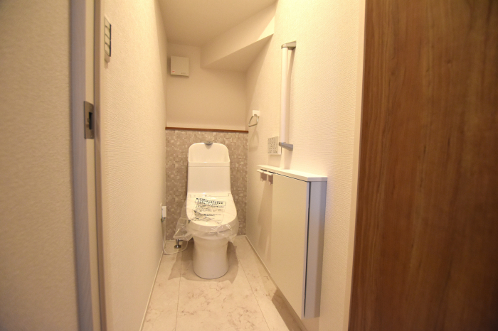 ペーパーホルダー脇の収納キャビネットに加え、備え付け収納を設置。トイレットペーパー(12個入)を袋ごと収納できる奥行を確保しています。
