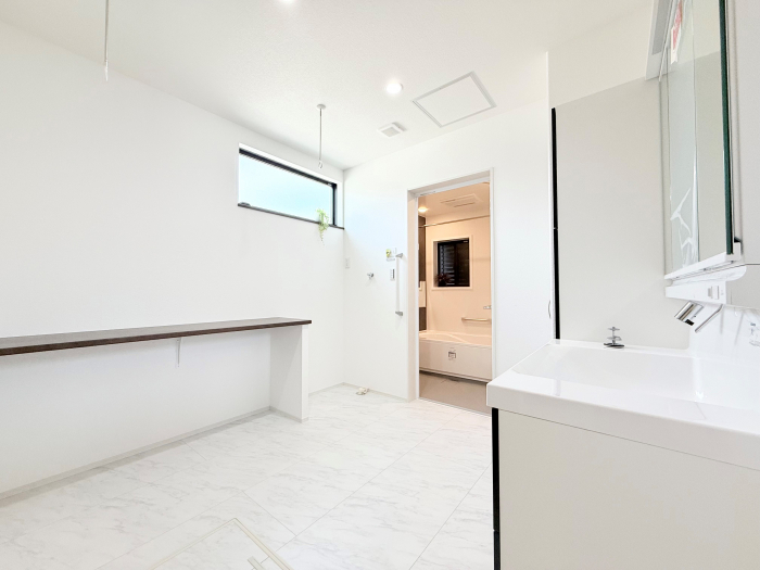 てまなし排水口、エコハンドル、キレイアップカウンター・水栓など工夫がいっぱい。ゆとりある洗面空間を実現。