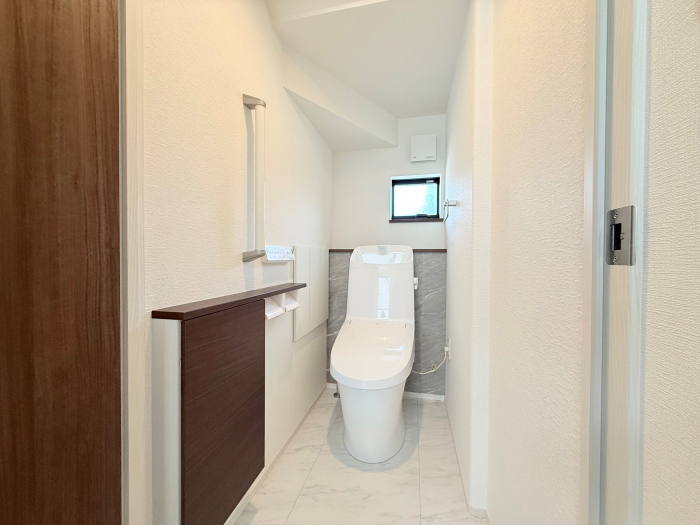 ペーパーホルダー脇の収納キャビネットに加え、備え付け収納を設置。トイレットペーパー(12個入)を袋ごと収納できる奥行を確保しています。
