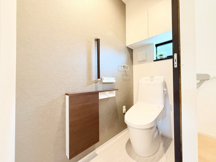 ペーパーホルダー脇の収納キャビネットに加え、備え付け収納を設置。トイレットペーパー(12個入)を袋ごと収納できる奥行を確保しています。