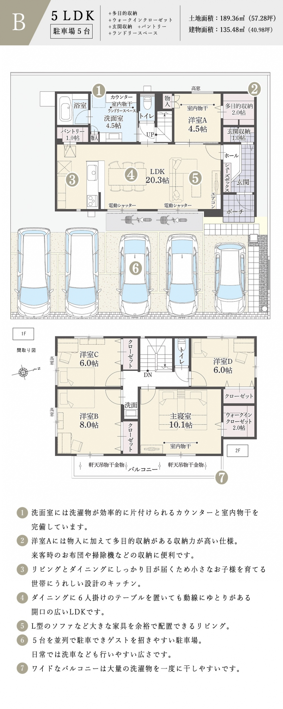 - 間取り:5LDK+ 多目的収納+ ウォークインクローゼット+ 玄関収納+ パントリー+ ランドリースペース