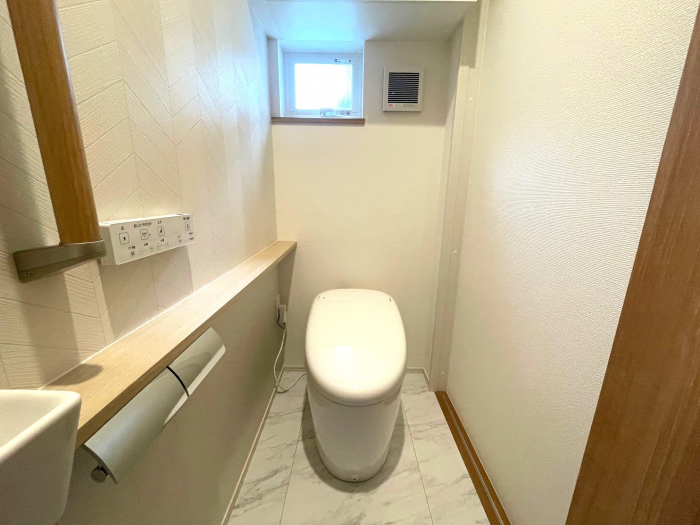 ペーパーホルダー脇の収納キャビネットに加え、備え付け収納を設置。トイレットペーパー(12個入)を袋ごと収納できる奥行を確保しています。