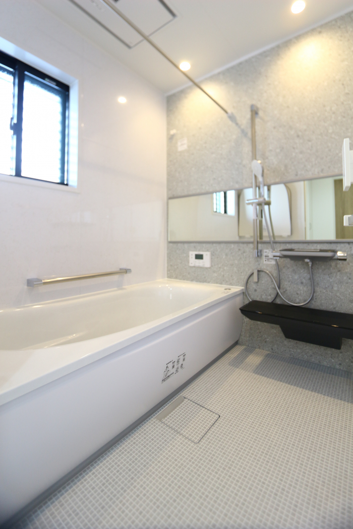 少し大きめ1717(1坪)サイズ。バリアフリー仕様のシステムバス。保温材付きの魔法びん浴槽。お掃除ラクラクほっカラリ床。