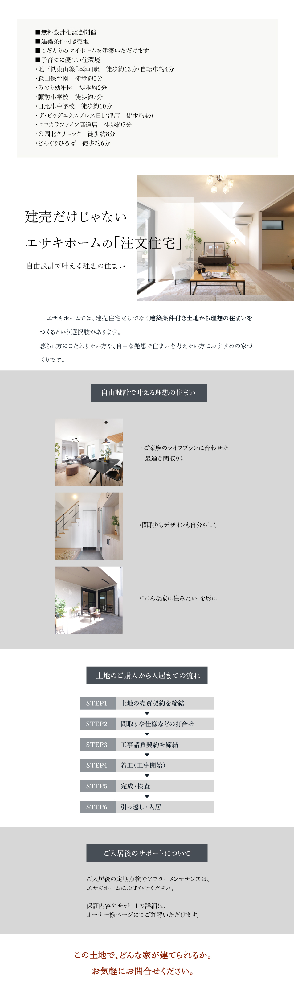 ・この土地は、土地売買契約締結後3ヶ月以内に当社と住宅の建築請負契約を締結していただくことを取引条件とします。万一期限までに建築請負契約が成立しない場合には、契約の無効が確定し受領済金は全額無利息にて返還します。