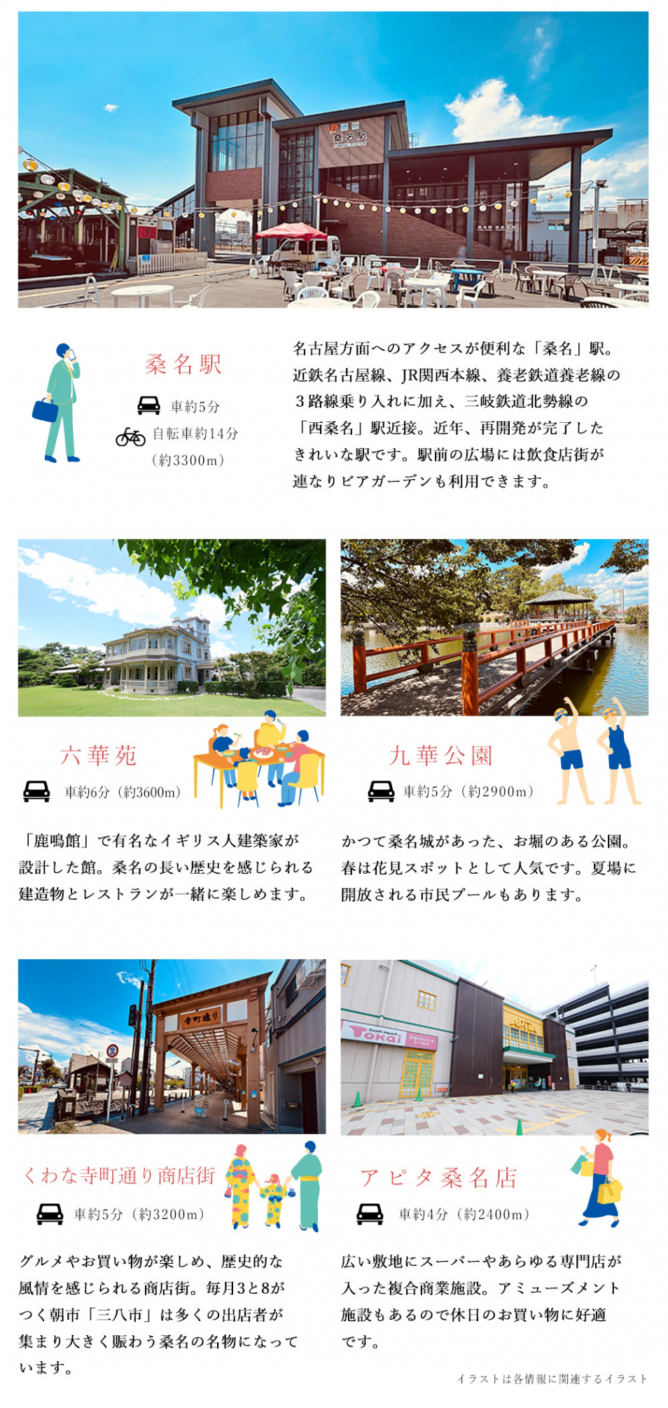 ・所要時間は地図上の概測距離を80m=徒歩1分、250m=自転車1分で計算したものです。