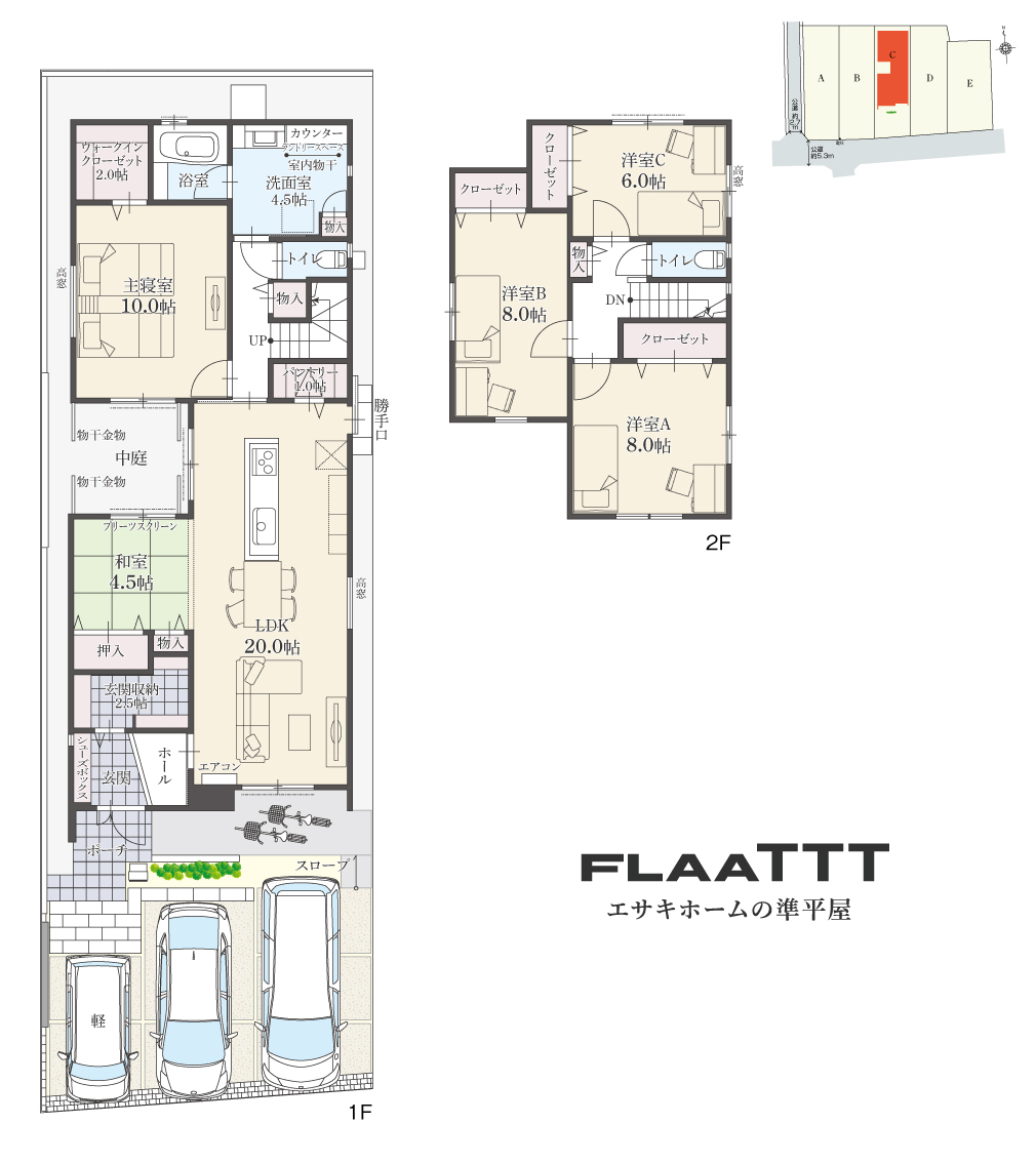 C棟には中庭があるため1階で洗濯物を外干しできます。LDK、畳コーナー、主寝室に面しているため各収納への動線も良いです。