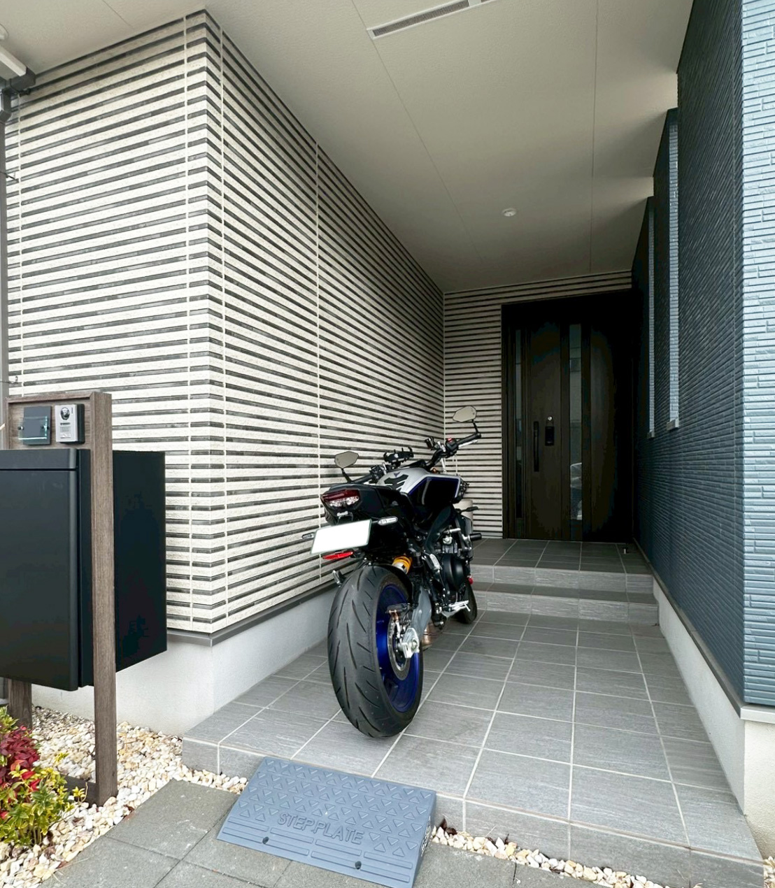 広い玄関ポーチは、お気に入りのバイク置き場に。前に住んでいた家ではそもそも置き場がなくて、バイクを買うこと自体諦めていたんです。でもこの広い玄関ポーチでは、雨風をしのげるだけでなく、夜でもポーチライトのおかげで安心してバイクのお手入れができます。さらに、玄関収納にバイクのメンテナンス用品をまとめてしまえるので、玄関の中も常にすっきり。急な来客があってもいつでも対応できます。ガレージを置かなくても実用的で、使い勝手の良さを日々実感しています。